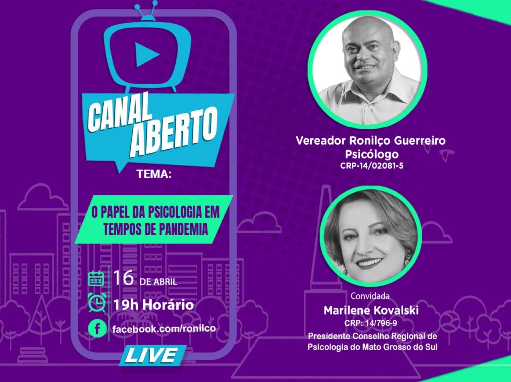 Por Jakson Pereira Nesta sexta-feira (15) o vereador Ronilço Guerreiro recebe na live Canal Aberto a presidente do Conselho Regional de Psicologia, Marilene Kovalski, para conversar sobre o tema “O papel da psicologia em tempos de Pandemia”. A live será realizada a partir das 19h na página de Guerreiro na rede social Facebook (facebook.com/ronilco). “O […]