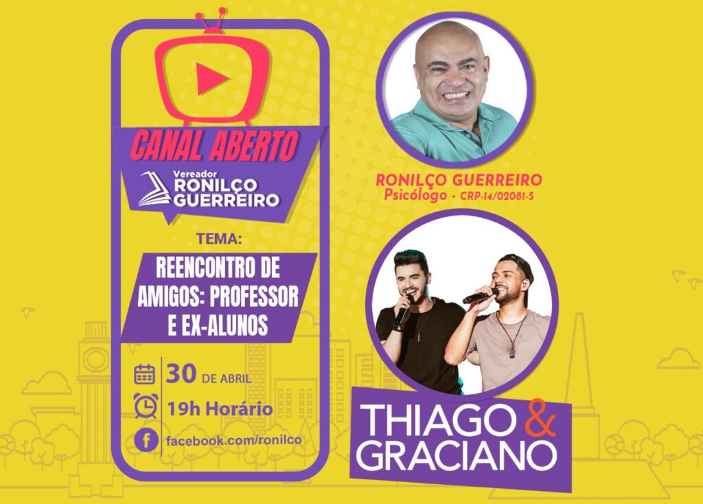 Por Jakson Pereira Que tal uma sexta-feira com muita música, bate-papo descontraído e boas histórias? O Canal Aberto, live semanal apresentada pelo vereador Ronilço Guerreiro, vai receber nesta semana a dupla sertaneja Thiago e Graciano. A live será realizada a partir das 19h na página de Guerreiro na rede social Facebook (facebook.com/ronilco). A live tem […]